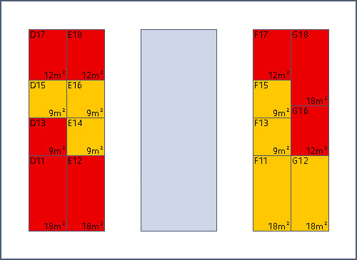 Die Stände in rot sind gebucht, in orange reserviert und in gelb verfügbar.